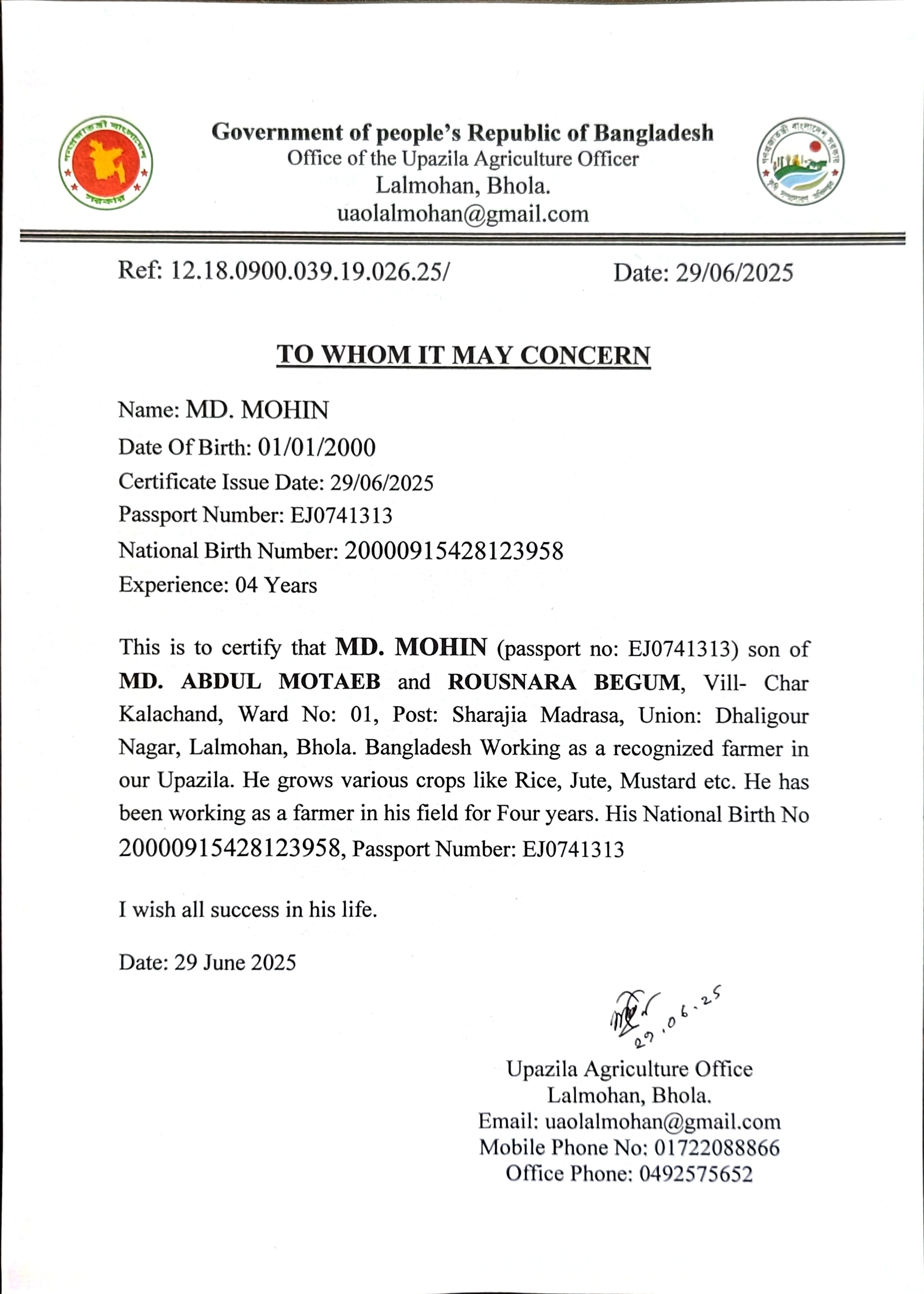| ৯ | Farmers Certificate: Md. Mohin | | ৩০-০৬-২০২৫ | দেখুন | |
